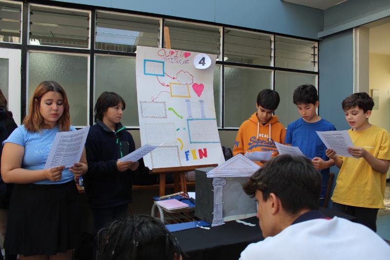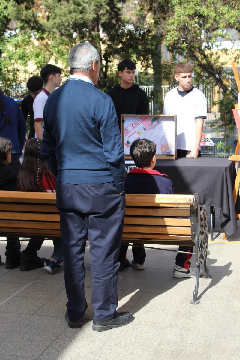 El viernes 26 continuó la celebración en el patio de Educación Básica con nuestro Director, M. Félix Albagly Giroux narrando el cuento “No te rías, Pepe” de Keiko Kasza, acompañado de estudiantes de 4º Medios, Gaspar Allendes, Elena Molina, Amanda Gallardo, Diego Stetcher y Ana Bustos, quienes representaban el texto narrado con efectos musicales. Luego, durante toda la jornada escolar los/as alumnos/as desde 3º Básico en adelante, expusieron sobre el libro que leyeron en marzo o abril correspondiente al Plan Lector. Pudimos presenciar teatrillos kamishibai, juegos interactivos, representaciones, entre otros, en los patios de Básica y Media.